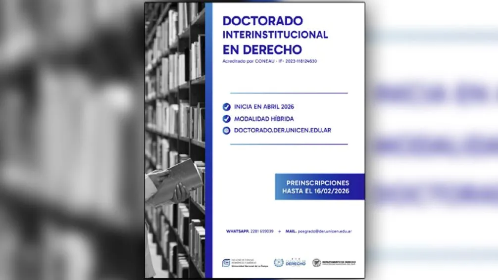 La Facultad de Derecho de la Universidad Nacional del Centro de la Provincia de Buenos Aires (UNICEN) informa que se encuentran abiertas las preinscripciones al Doctorado Interinstitucional en Derecho - Cohorte 2026, una propuesta académica de excelencia, acreditada por la Comisión Nacional de Evaluación y Acreditación Universitaria (CONEAU).
