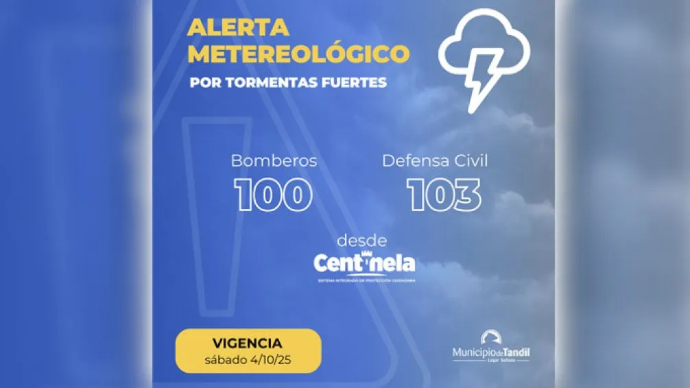 El Servicio Meteorológico Nacional emitió una Alerta Amarilla por tormentas fuertes que afectará a Tandil y zonas aledañas este sábado 4 de octubre de 2025.