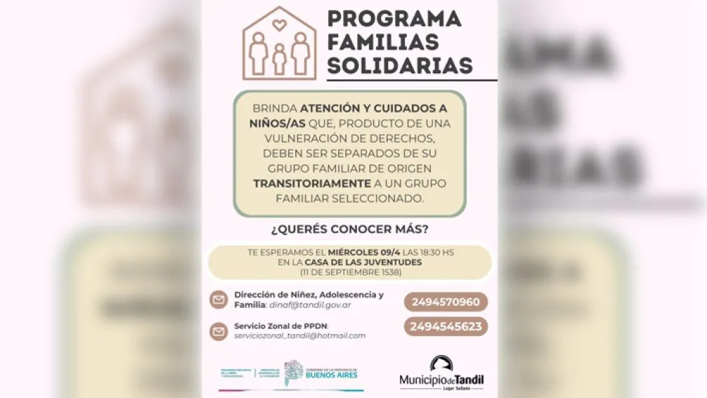 El miércoles 9 de abril se realizará una charla informativa sobre el Programa Familias Solidarias, a través del cual se brinda cuidado temporal a niños, niñas y adolescentes que no pueden vivir con sus familias de origen.