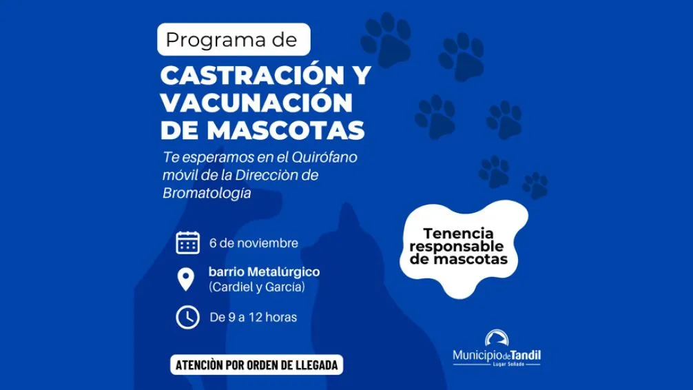 El Municipio de Tandil, a través de la Dirección de Bromatología y Zoonosis, continúa desarrollando el Programa de Castraciones y Vacunaciones Gratuitas en los distintos barrios de la ciudad. Este jueves, el operativo se llevará a cabo en el barrio Metalúrgico, con atención de 9:00 a 12:00 horas mediante el quirófano móvil.